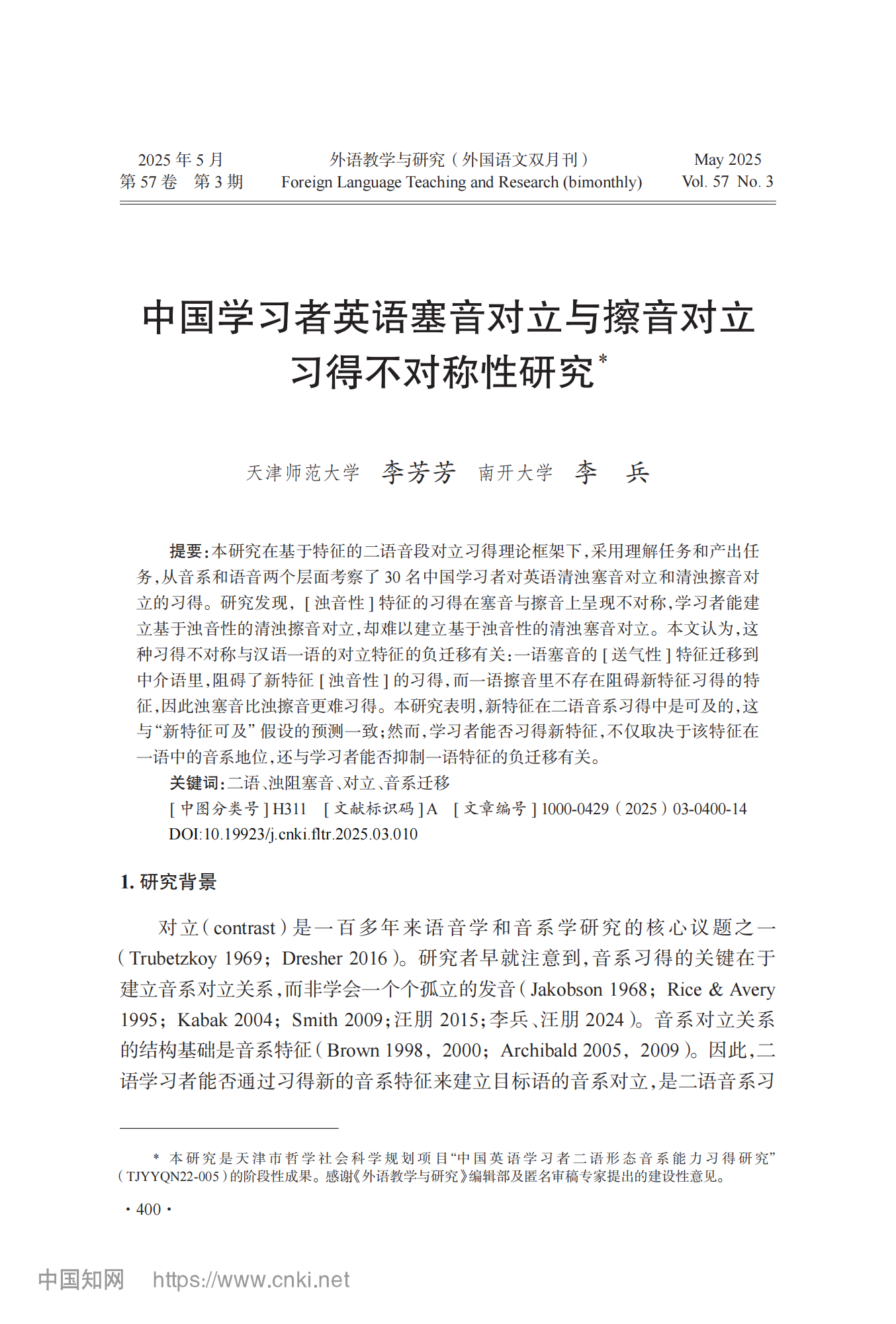 参考引用格式:李芳芳,李兵.中国学习者英语塞音对立与擦音对立习得不对称性研究[J].外语教学与研究,2025,57(03):400-413.DOI:10.19923/j.cnki.fltr.2025.03.010.