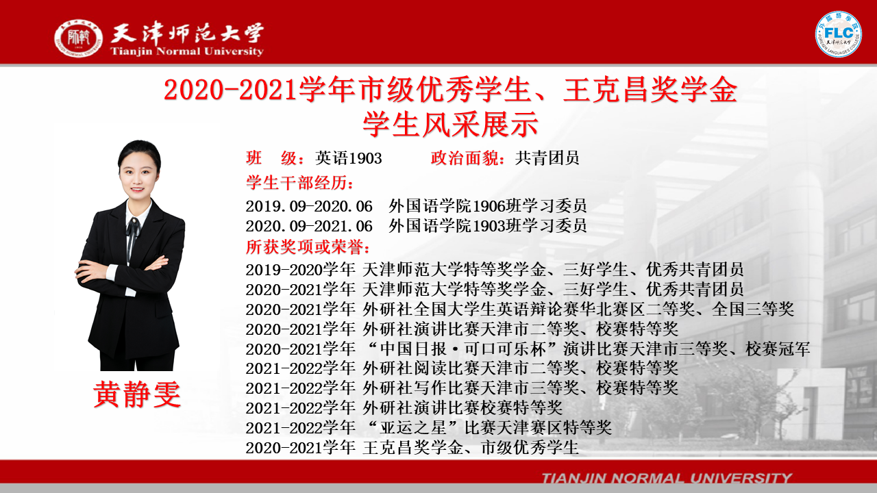 2020-2021学年市级优秀学生、王克昌奖学金获得者——黄静雯